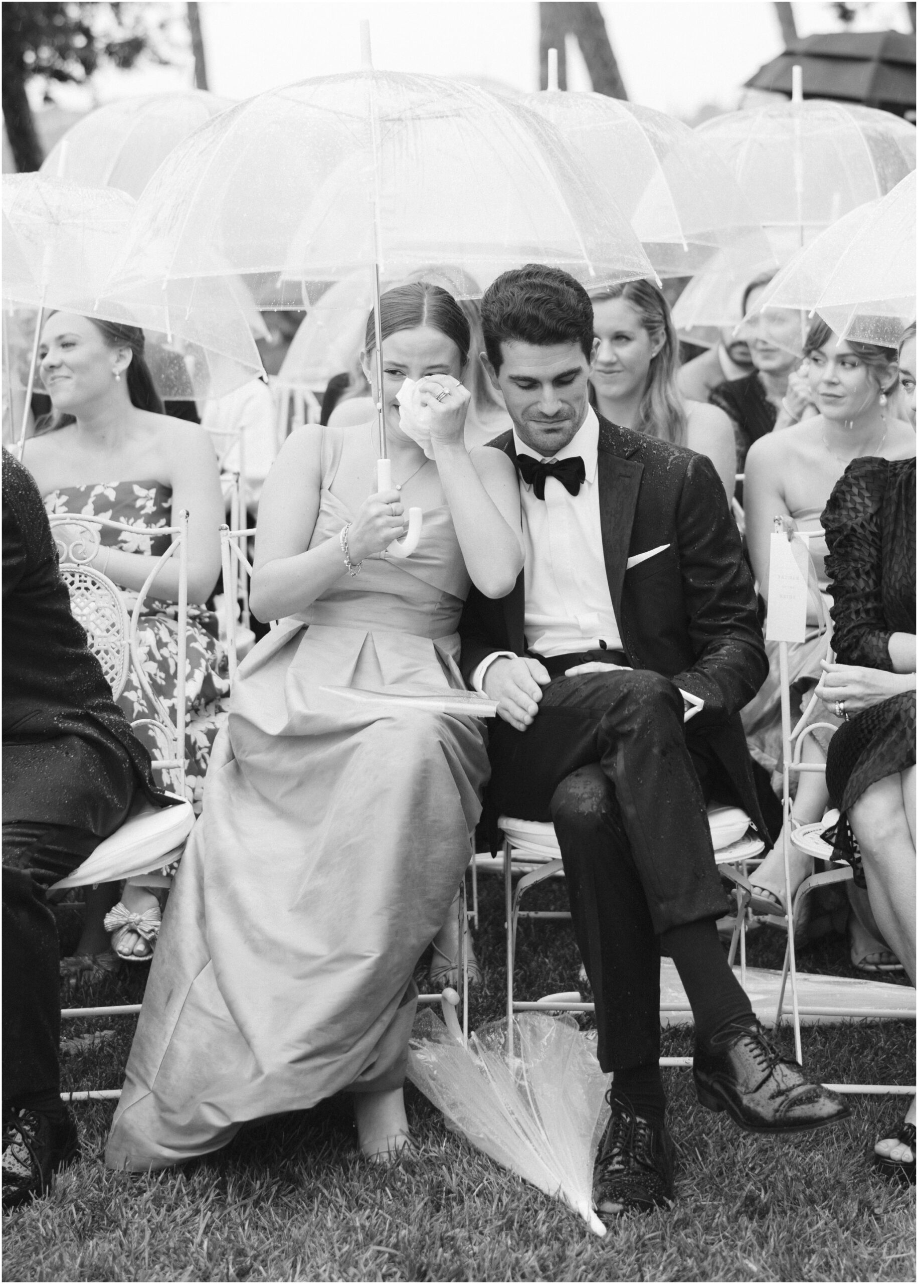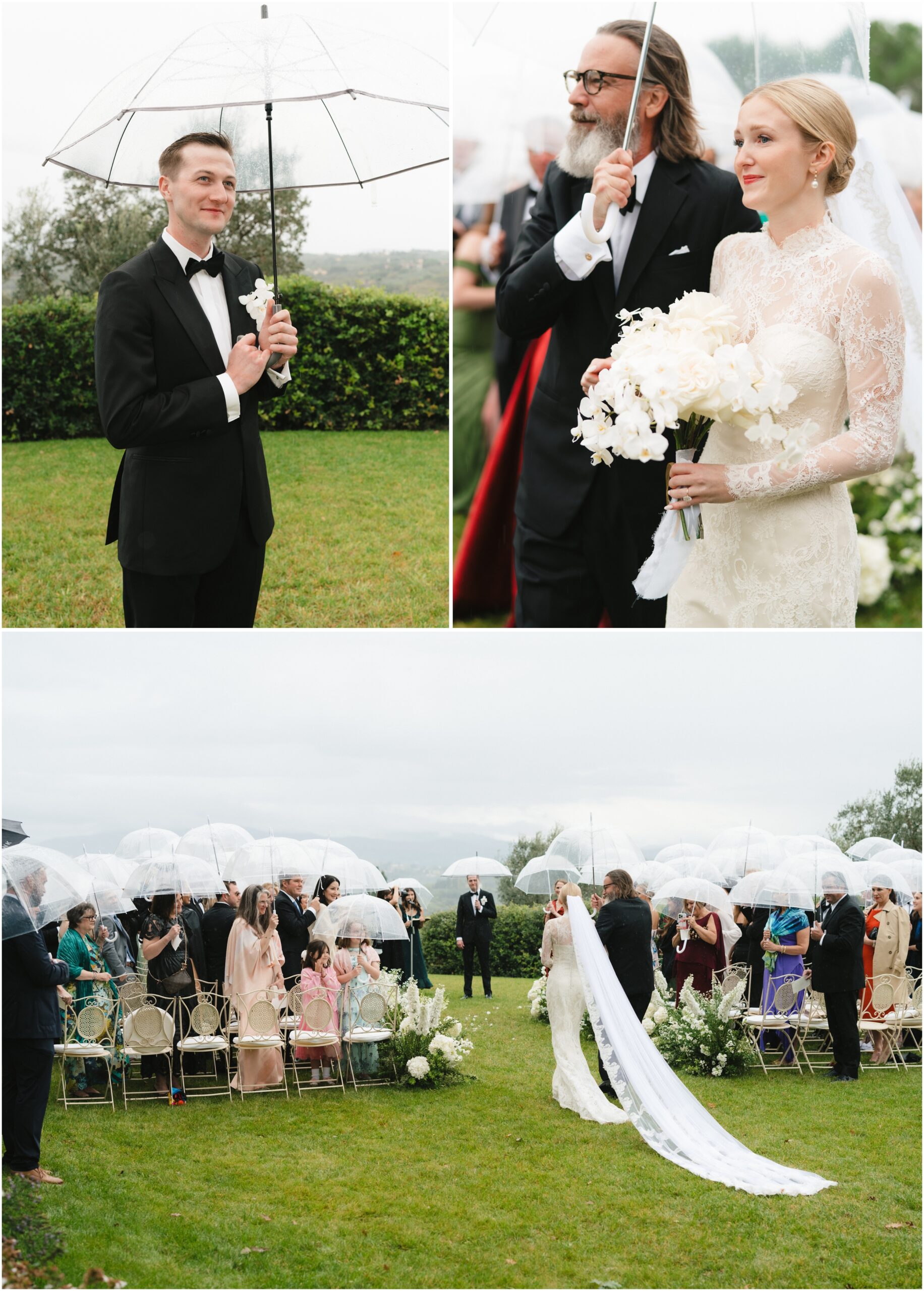 On the wedding day, the skies opened and a soft rain fell. Instead of retreating indoors, the couple chose to continue with their outdoor ceremony. Guests pulled out umbrellas and laughed through the rain, a moment that felt straight out of a film. There was something undeniably romantic about hearing vows spoken against the Tuscan hills, being surrounded by olive groves and rainfall.